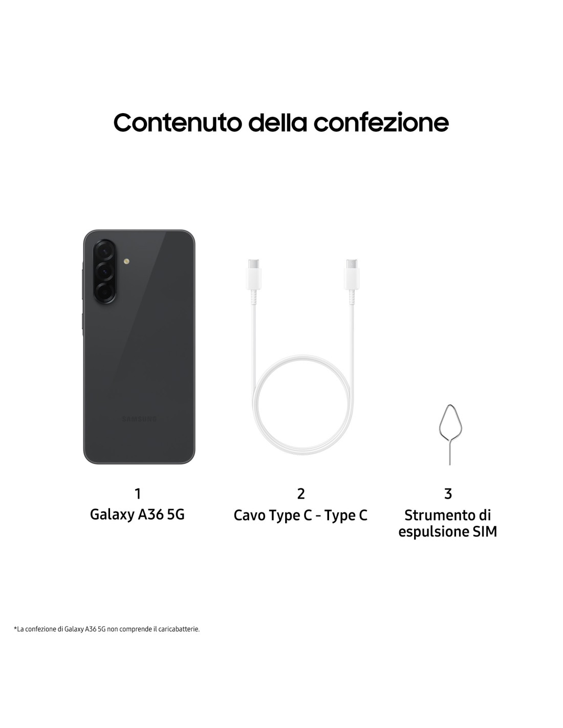 Samsung Galaxy A36 5G, Smartphone con Funzioni intelligenti, Display Super AMOLED 6.7”, 8GB RAM, 256GB, Camera 50MP, Batteria 5.000 mAh, IP67, Awesome Black. Dimensioni diagonale schermo: 17 cm (6.7"), Risoluzione del display: 1080 x 2340 Pixel. Famiglia processore: Qualcomm Snapdragon, Modello del processore: 6 Gen 3. Capacità della RAM: 8 GB, Capacità memoria interna: 256 GB. Risoluzione fotocamera posteriore (numerico): 50 MP, Tipo di fotocamera posteriore: Tripla fotocamera. Capacità della scheda SIM: Doppia SIM. Sistema operativo incluso: Android 15. Capacità della batteria: 5000 mAh. Colore del prodotto: Nero. Peso: 195 g