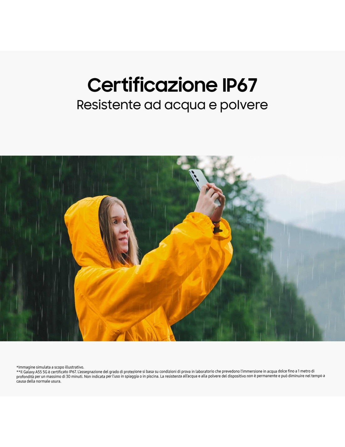 La protezione IP67 contro polvere e acqua non è solo una caratteristica aggiuntiva. È un vero e proprio scudo protettivo contro gli elementi atmosferici. Rimani connesso, cattura i tuoi ricordi ed esplora in tutta sicurezza: il tuo dispositivo è al riparo dallinfiltrazione di polvere e acqua.