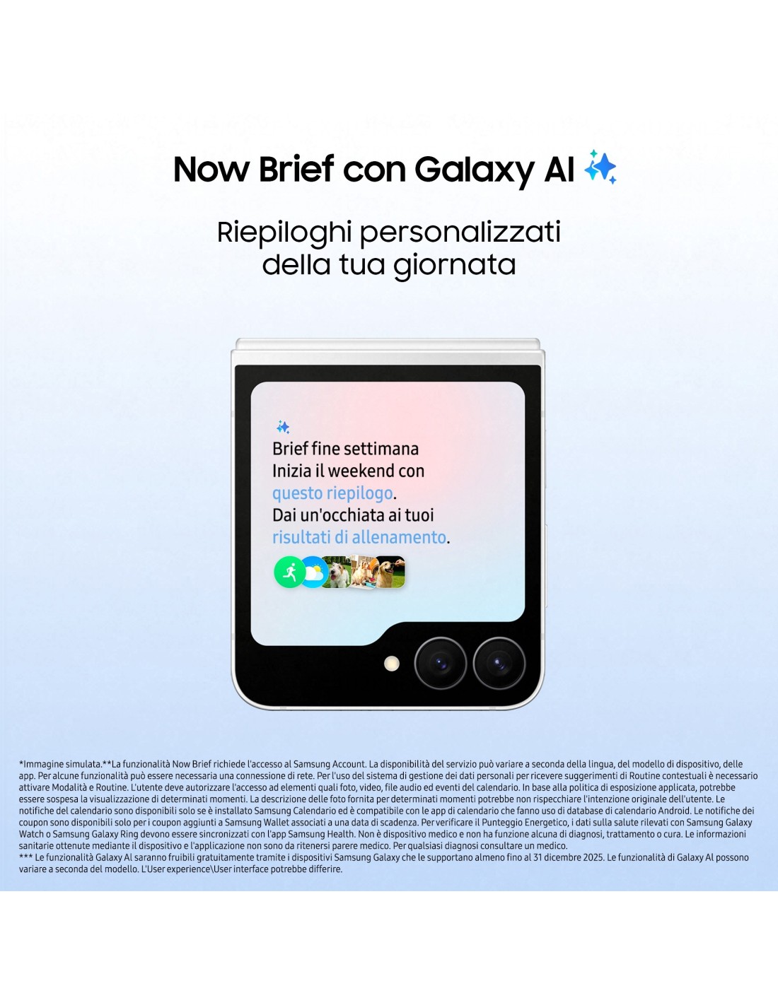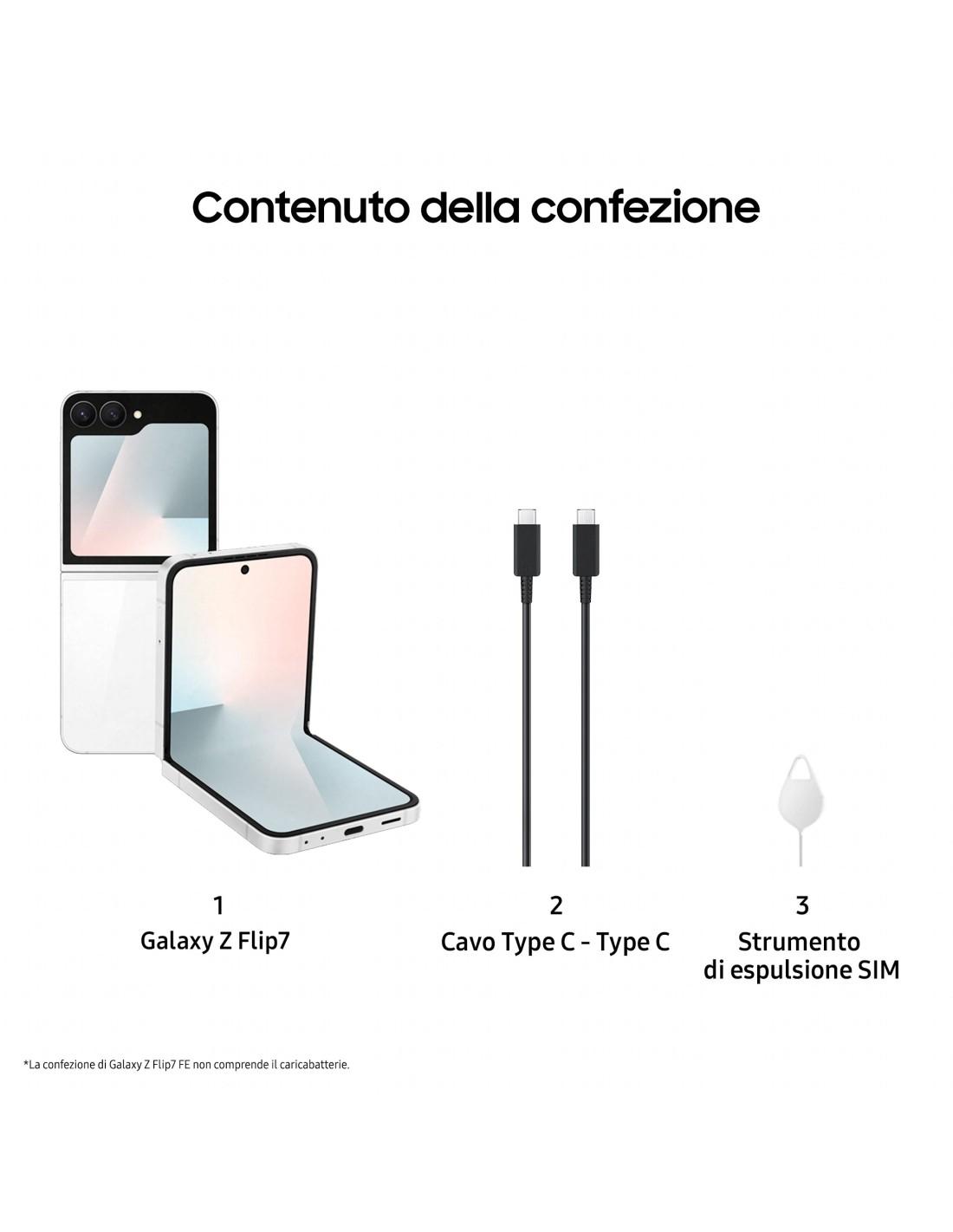 Samsung Galaxy Z Flip7 FE Smartphone AI, RAM 8GB, 128GB, Display 3,4" Super AMOLED/6,7" Dynamic AMOLED 2X, Fotocamera 50MP, White. Dimensioni diagonale schermo: 17 cm (6.7"), Risoluzione del display: 2640 x 1080 Pixel. Famiglia processore: Samsung Exynos, Modello del processore: 2400. Capacità della RAM: 8 GB, Capacità memoria interna: 128 GB. Risoluzione fotocamera posteriore (numerico): 50 MP, Tipo di fotocamera posteriore: Doppia fotocamera. Capacità della batteria: 4000 mAh. Colore del prodotto: Bianco. Peso: 187 g