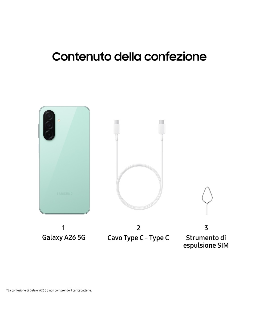 Samsung Galaxy A26 5G, Smartphone con Funzioni intelligenti, Display Super AMOLED 6.7”, 8GB RAM, 256GB, Batteria 5.000 mAh, memoria espandibile, Mint. Dimensioni diagonale schermo: 17 cm (6.7"), Risoluzione del display: 1080 x 2340 Pixel. Famiglia processore: Samsung Exynos. Capacità della RAM: 8 GB, Capacità memoria interna: 256 GB. Risoluzione fotocamera posteriore (numerico): 50 MP, Tipo di fotocamera posteriore: Tripla fotocamera. Capacità della scheda SIM: Dual SIM ibrida. Sistema operativo incluso: Android 15. Capacità della batteria: 5000 mAh. Colore del prodotto: Colore menta. Peso: 200 g